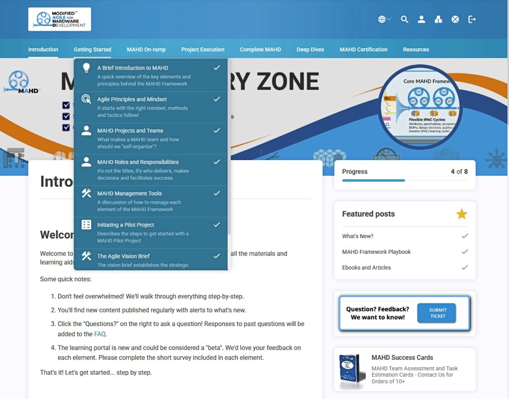The MAHD Mastery Zone (the Zone) is a comprehensive MAHD learning portal designed to help key roles and teams delve deeper into the principles and methods of Agile for hardware with the MAHD Framework.